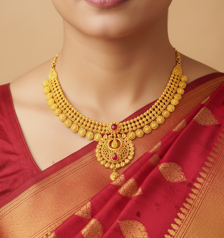 This Mini Haar necklace is a masterpiece of traditional Nepali jewelry, meticulously crafted to showcase the brilliance of pure gold. The design features a broad, three-tiered "Chatai" (mat-weave) style band, composed of delicate golden beads that create a rich, textured surface.